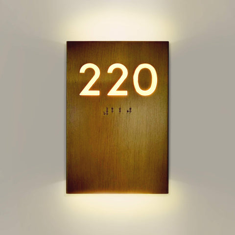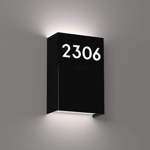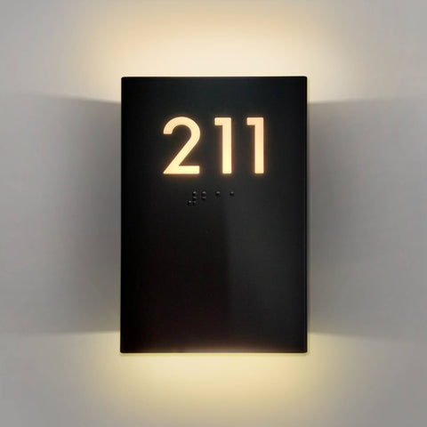 $160 LIST PRICE, for 100+ quantityShown in Dark Oxide (black) finish, with back-lit numbers and wall illumination up and down. Numbers and Braille come already installed, customized for your project.