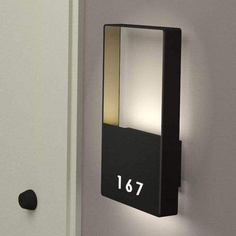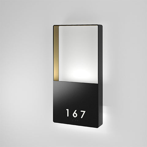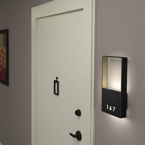 $390 LIST PRICE, for 100+ quantityShown in Dark Oxide (black) finish with Champagne inset, back-lit numbers and wall illumination up and down. ADA-compliant signage including Braille, to be customized for your project.