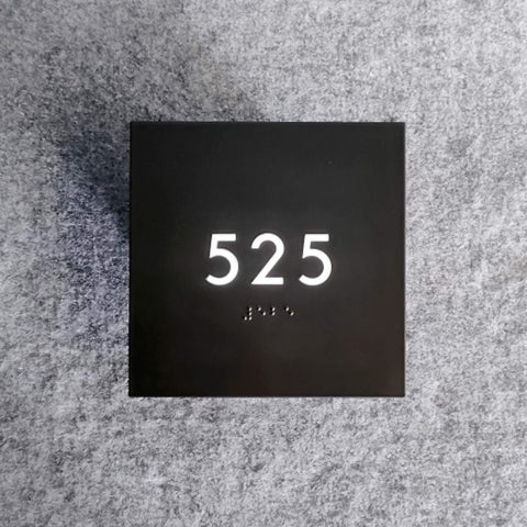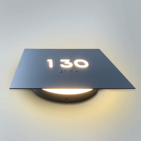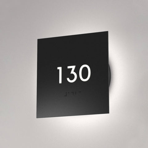 Shown in Dark Oxide painted finish, with backlit acrylic. Other colors are available. Numbers and Braille come already installed, customized for your project.