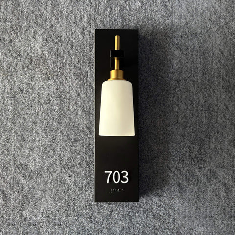$200 LIST PRICE, for 100+ quantityDark Oxide (black) finish, Light Antique Brass patina accent, opal glass shade, and opal acrylic numbers. Numbers and Braille come already installed, customized for your project.