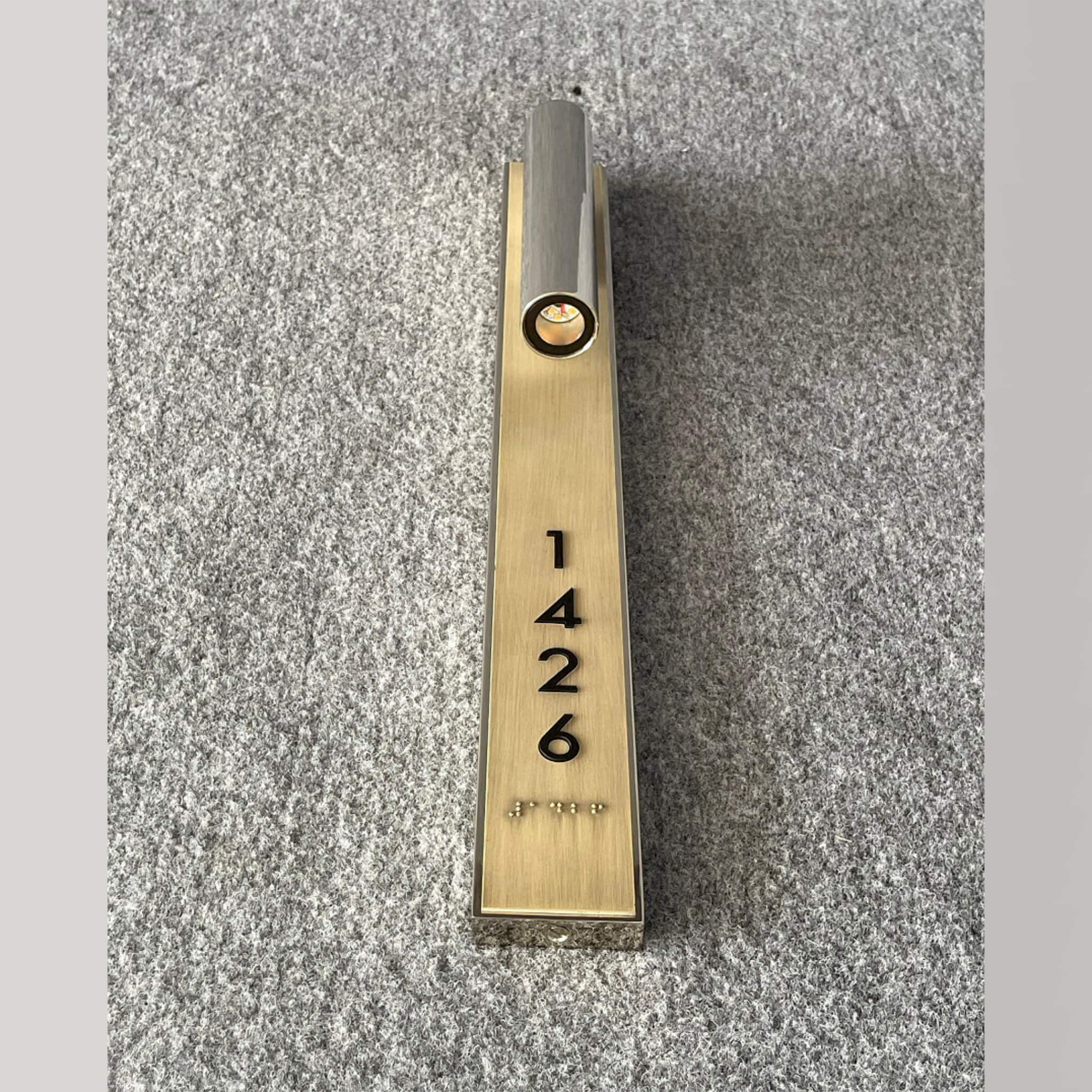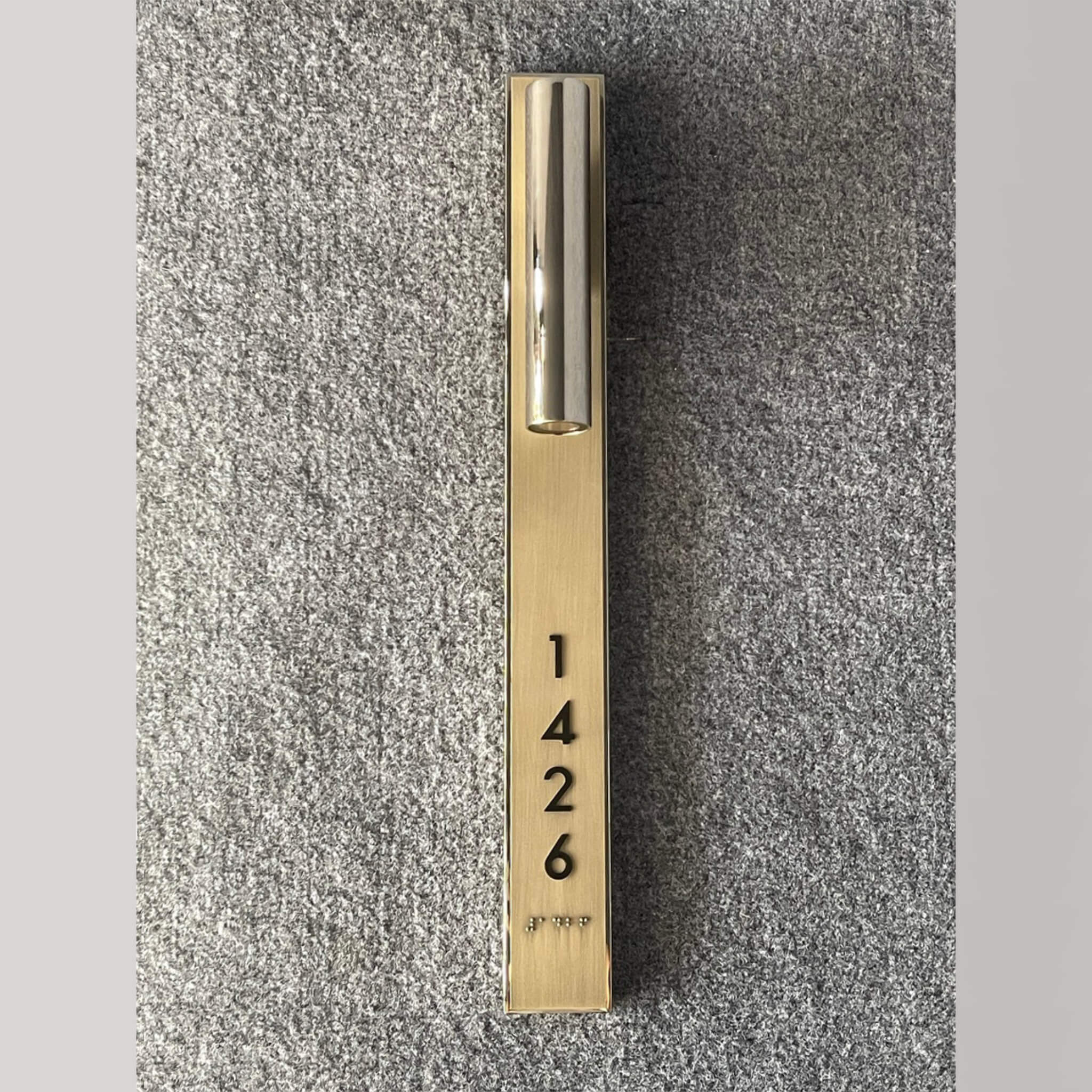 $264 LIST PRICE, for 100+ quantityShown in Polished Nickel finish, with painted wood grain and black acrylic numbers. Signage with Braille is included, customized for your project.
